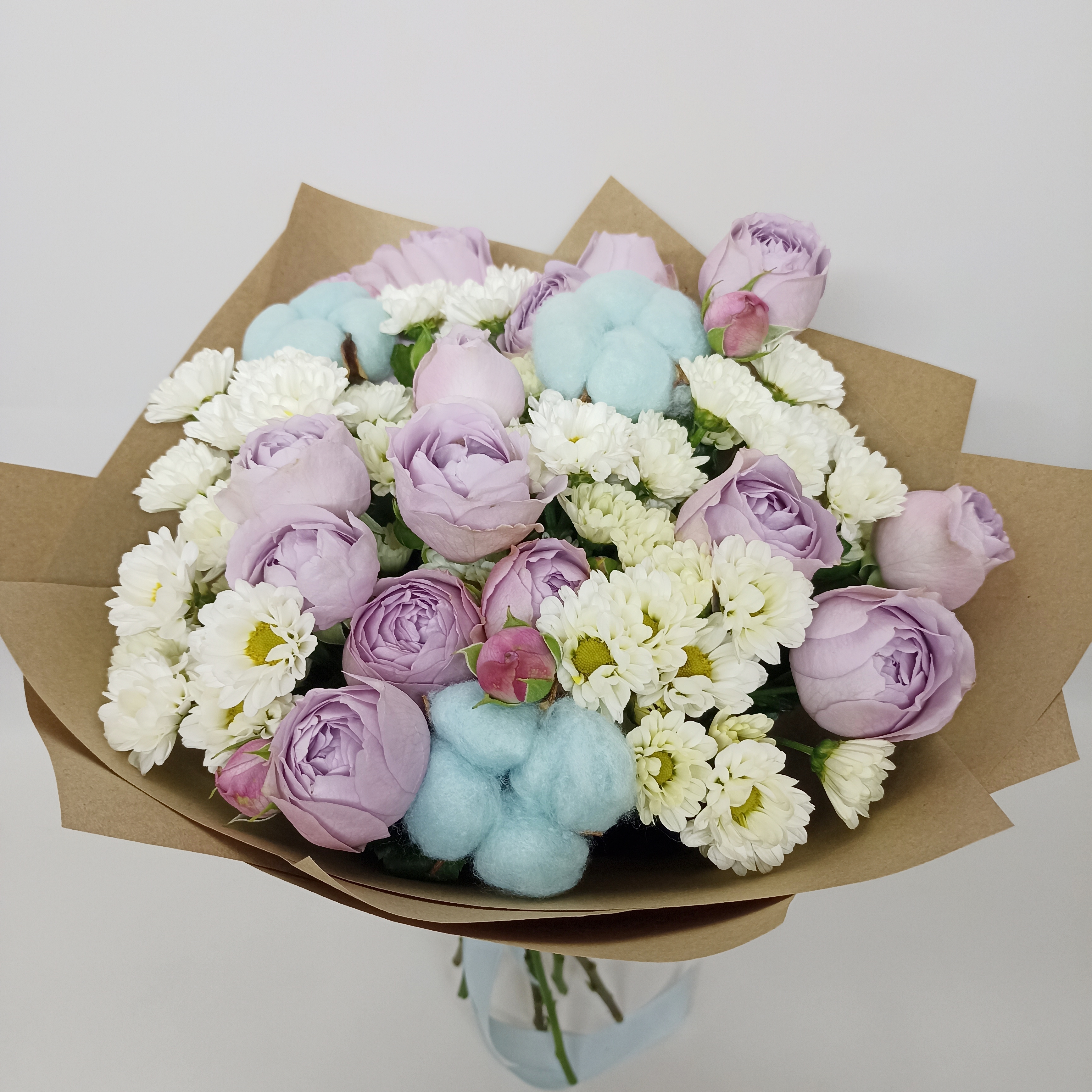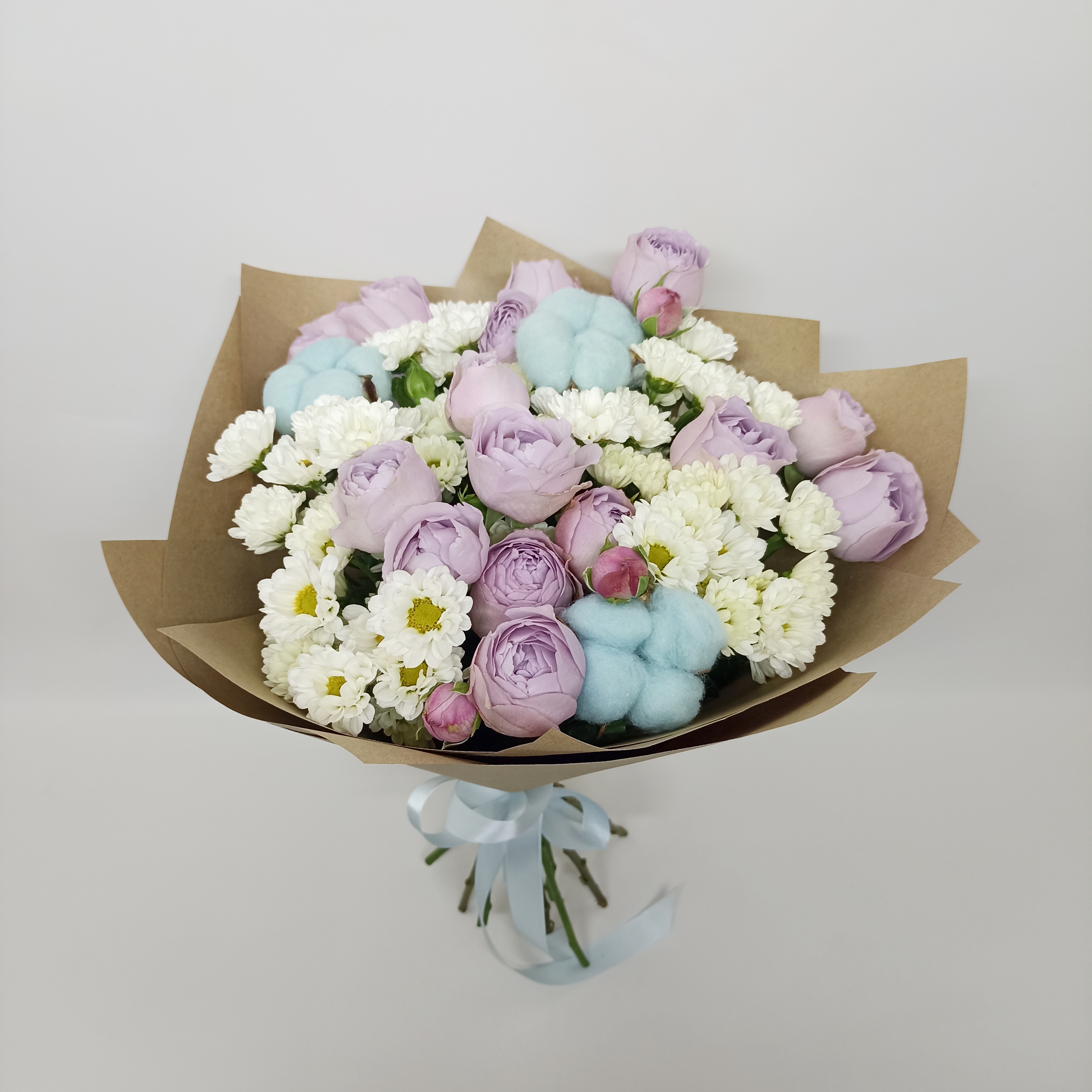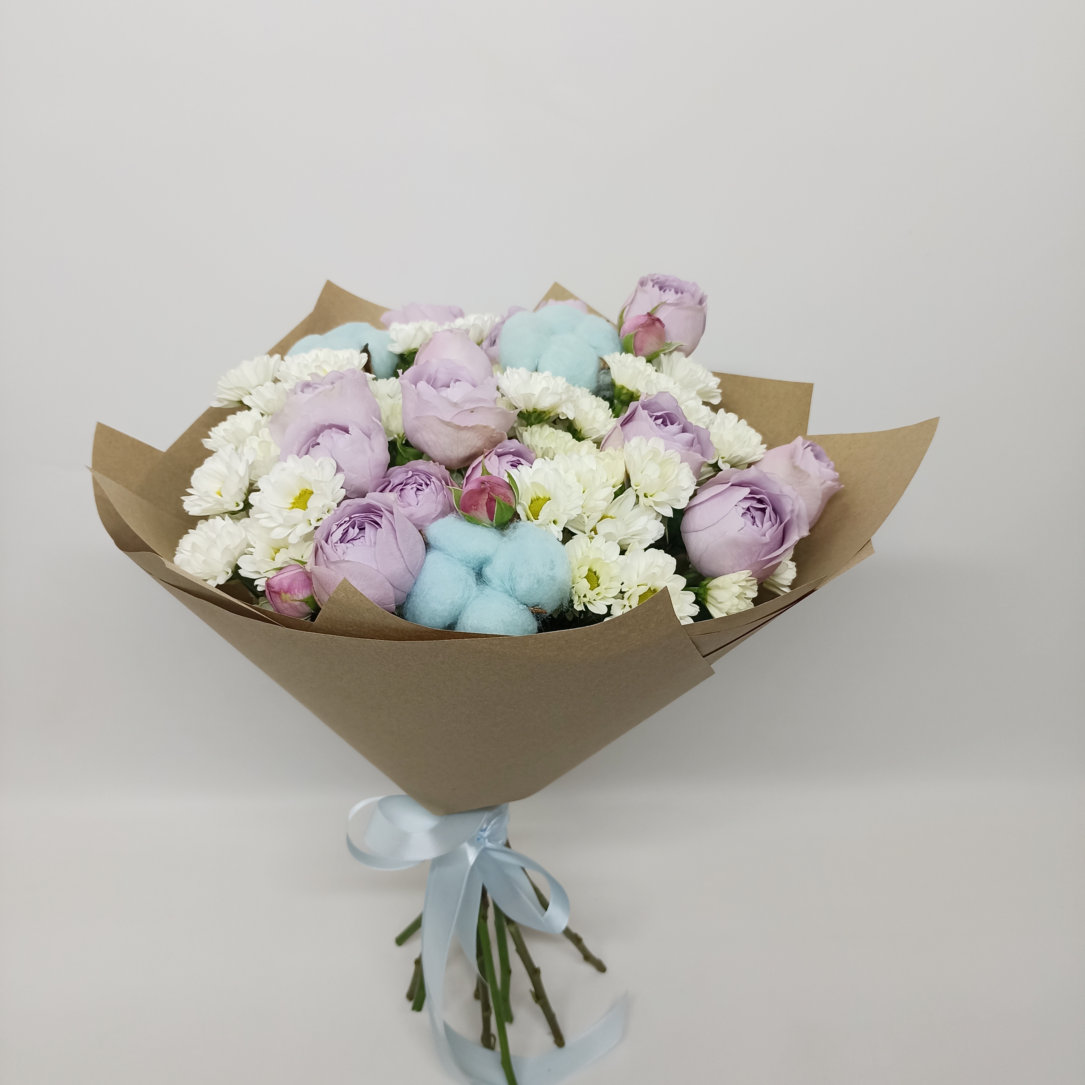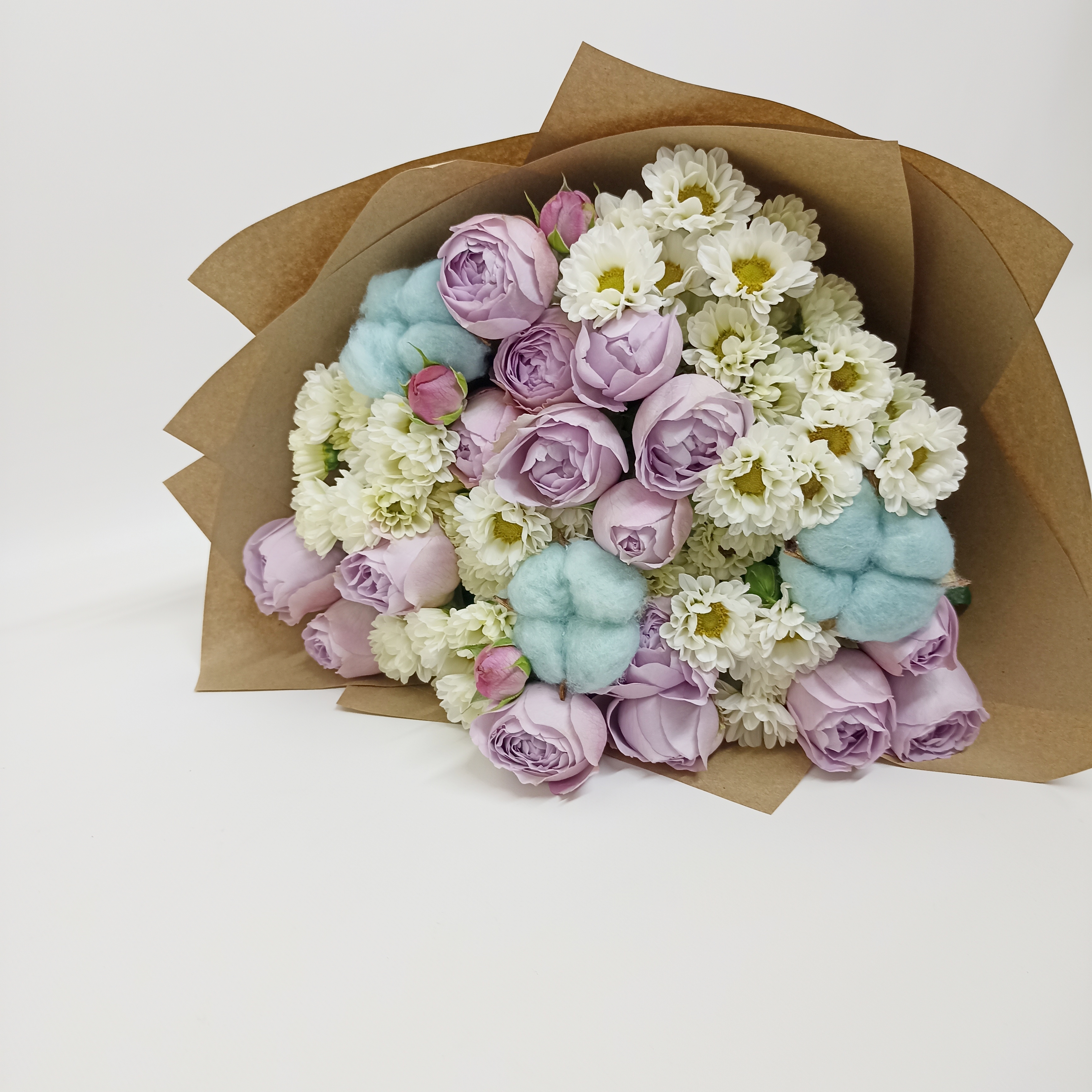 Элегантный, красочный букет из хризантем Сантини и нежной кустовой розы. Натуральный хлопок и упаковка из крафт-бумаги подчеркивают природную красоту цветов и создают атмосферу уюта. Идеальный подарок по любому поводу!
