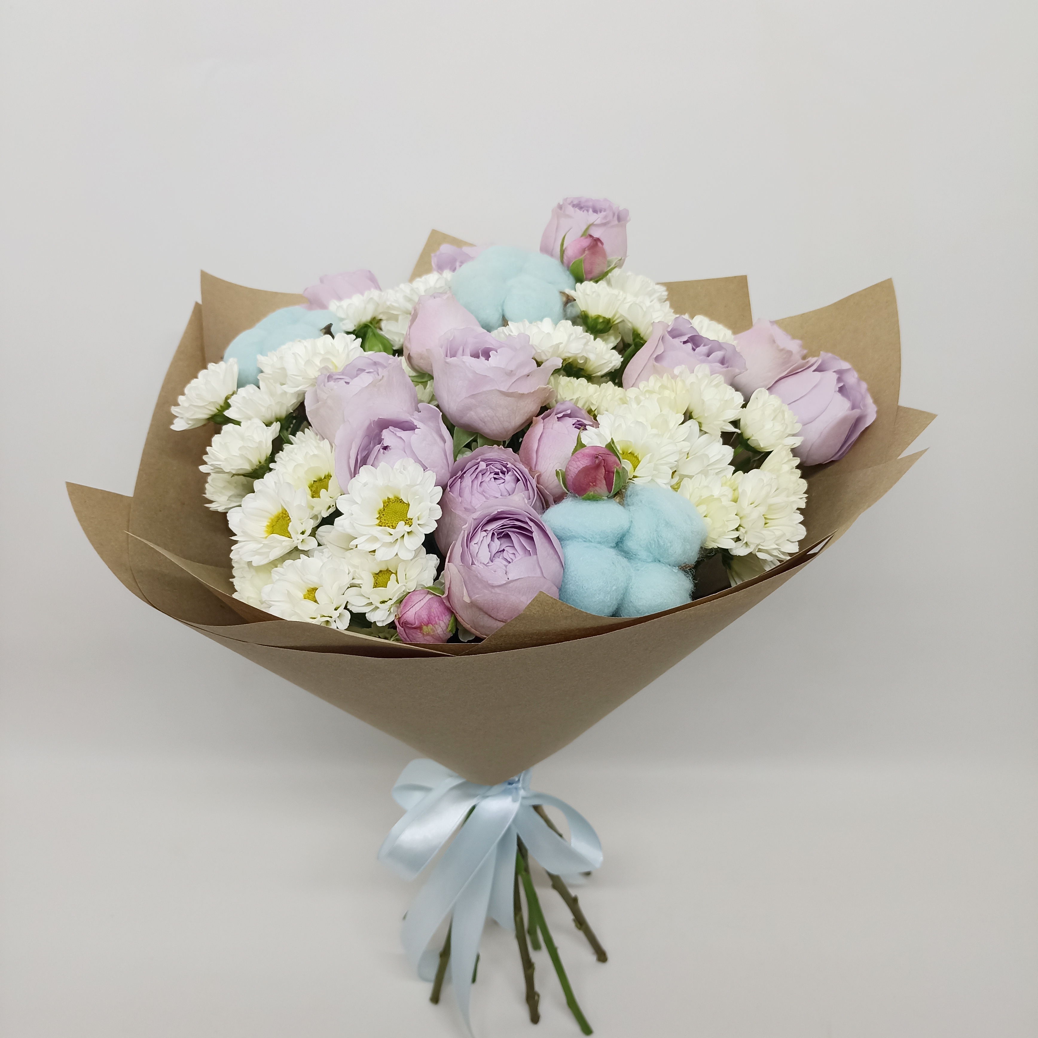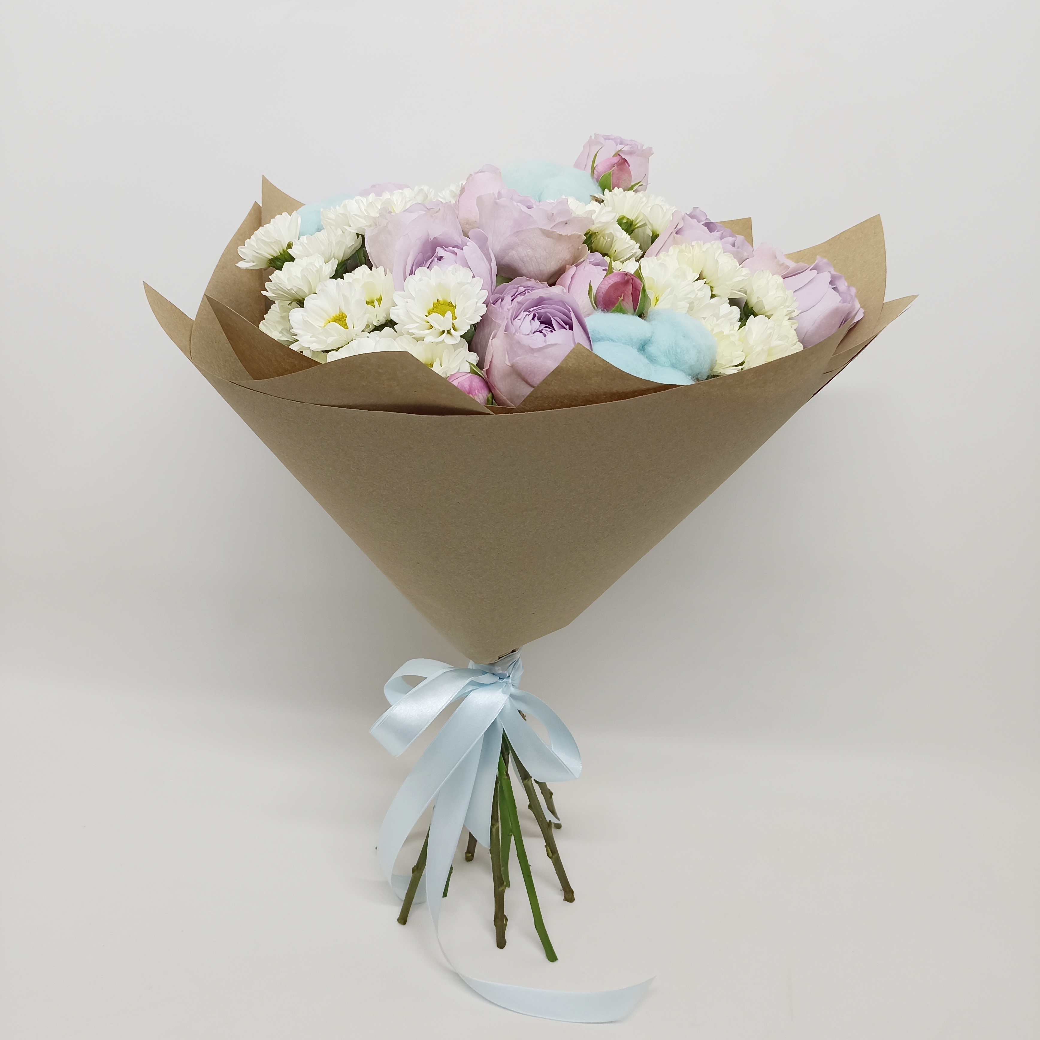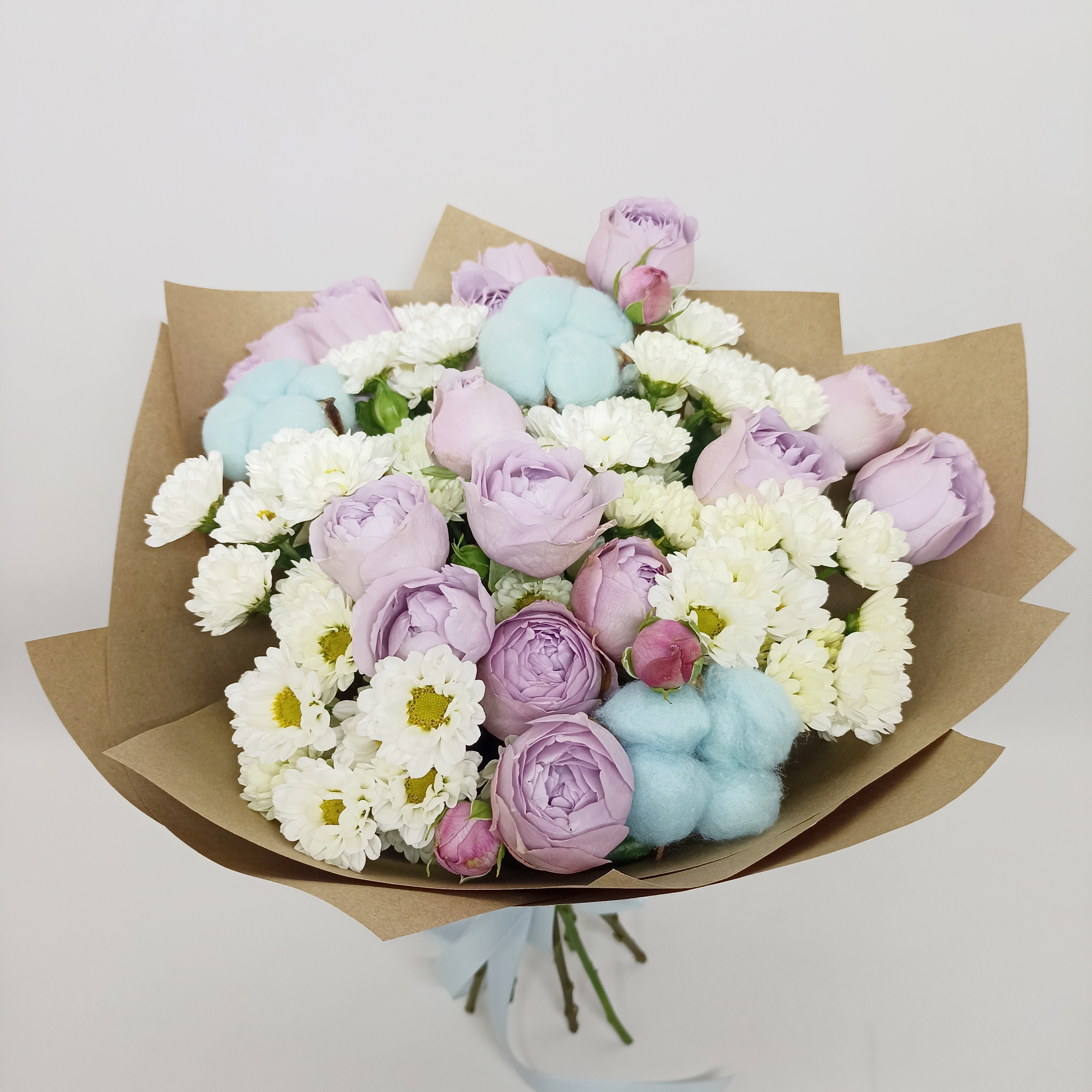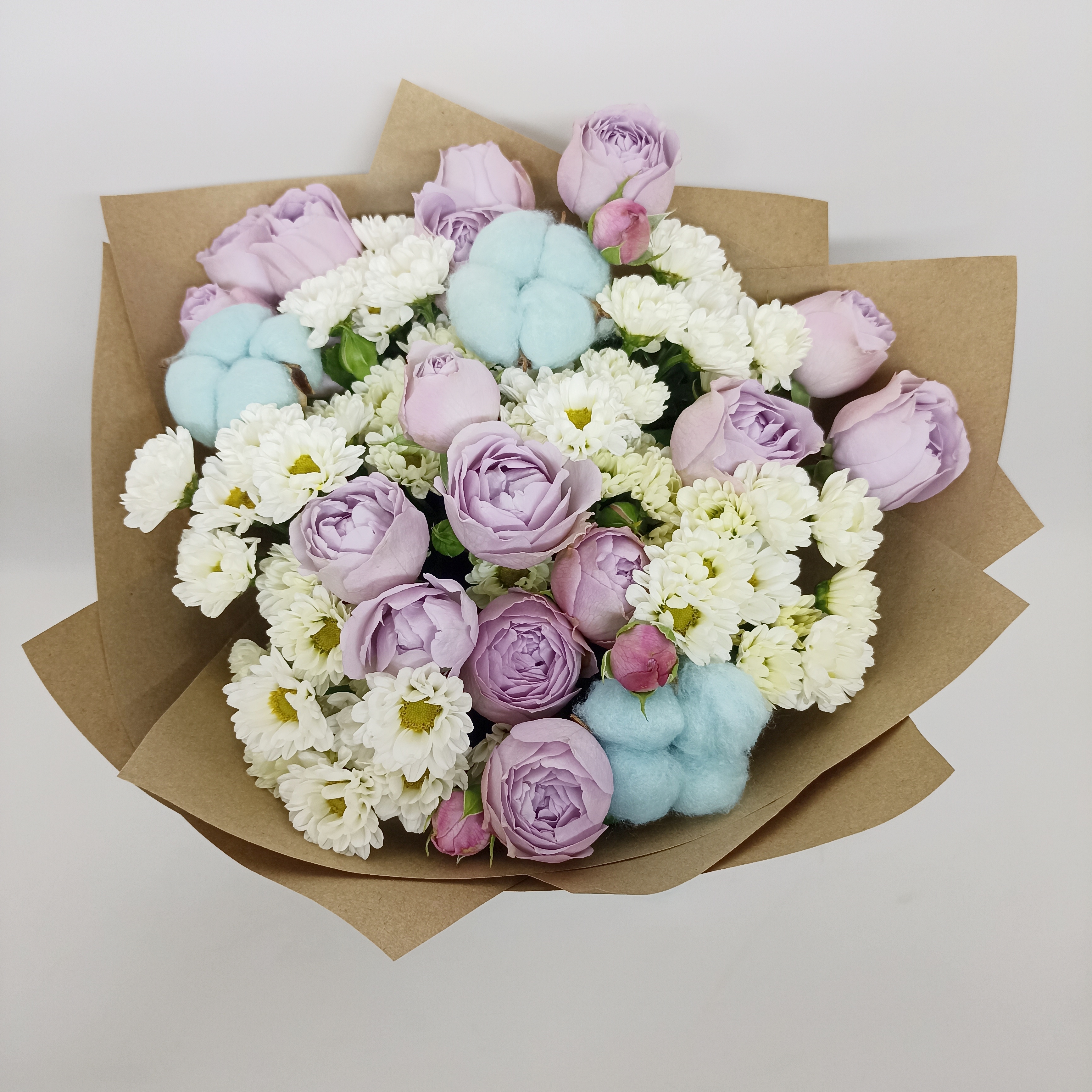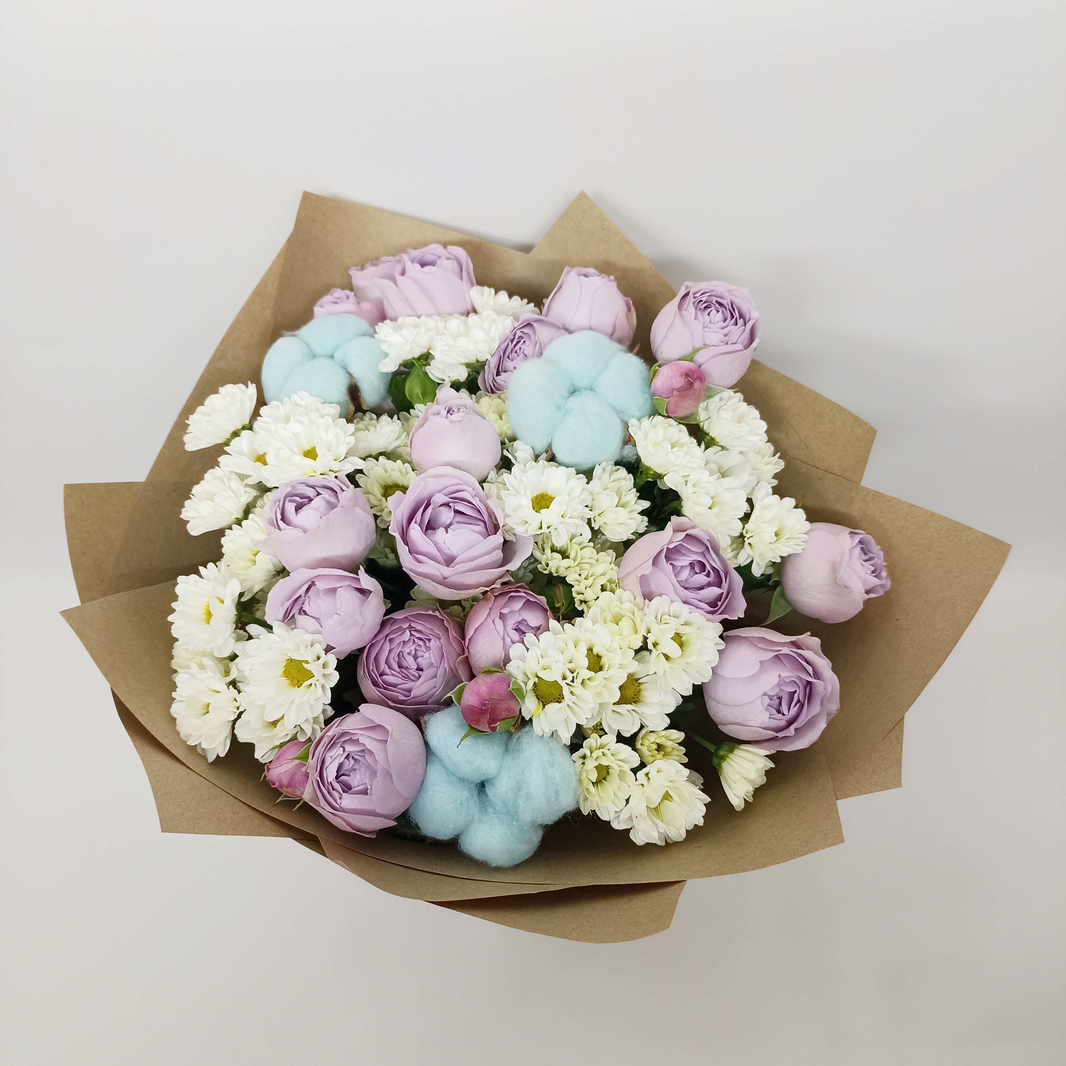 Элегантный, красочный букет из хризантем Сантини и нежной кустовой розы. Натуральный хлопок и упаковка из крафт-бумаги подчеркивают природную красоту цветов и создают атмосферу уюта. Идеальный подарок по любому поводу!