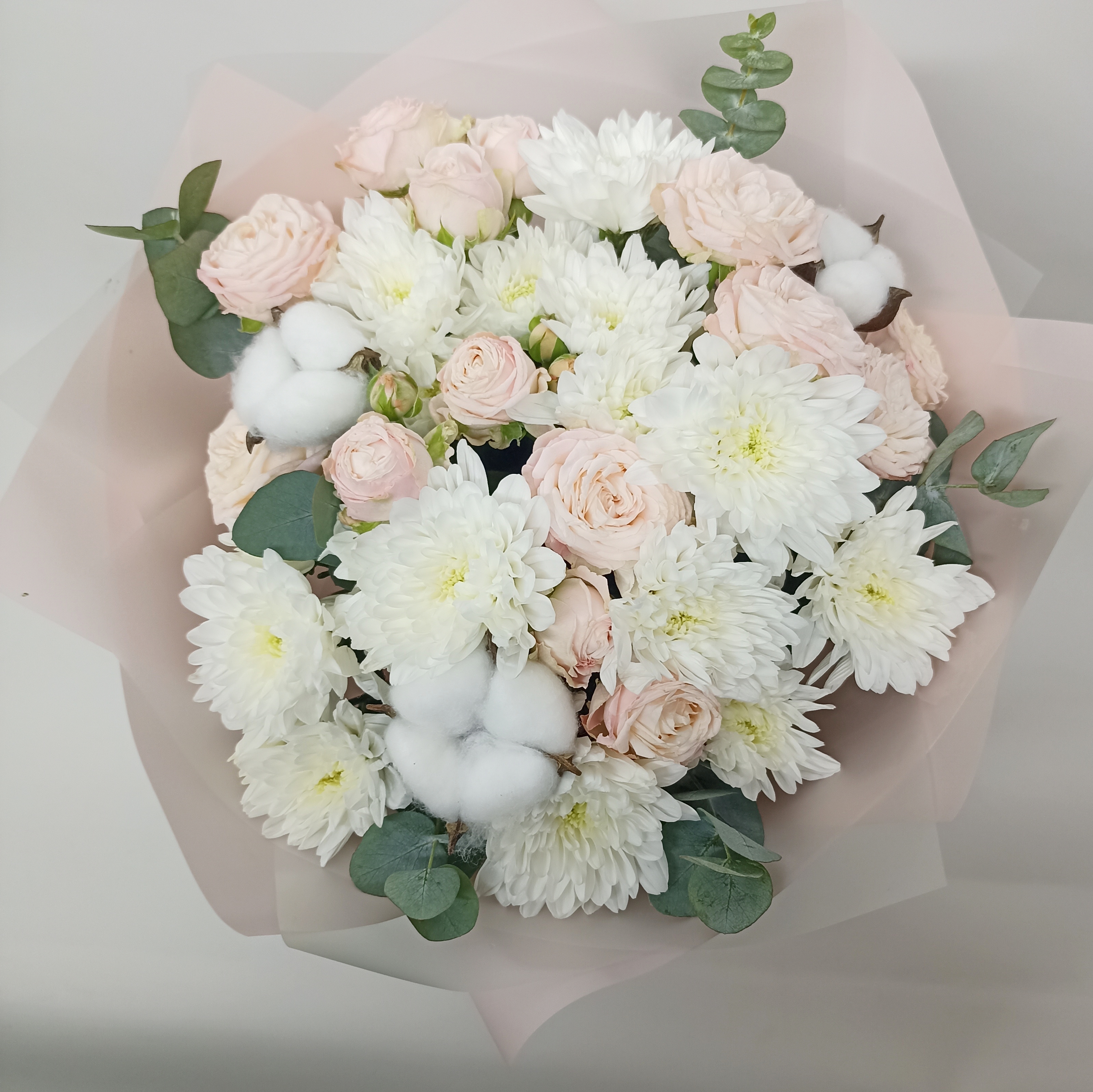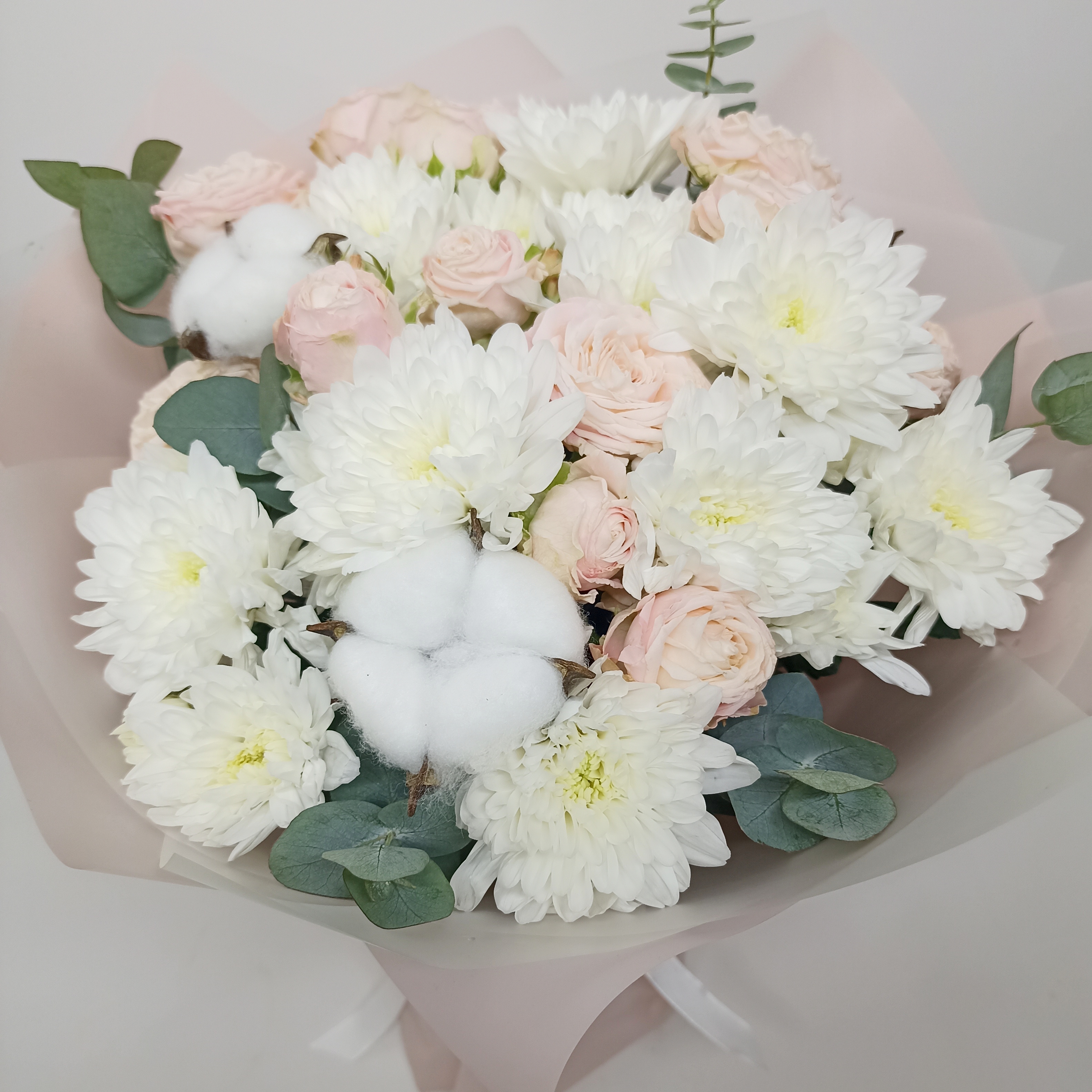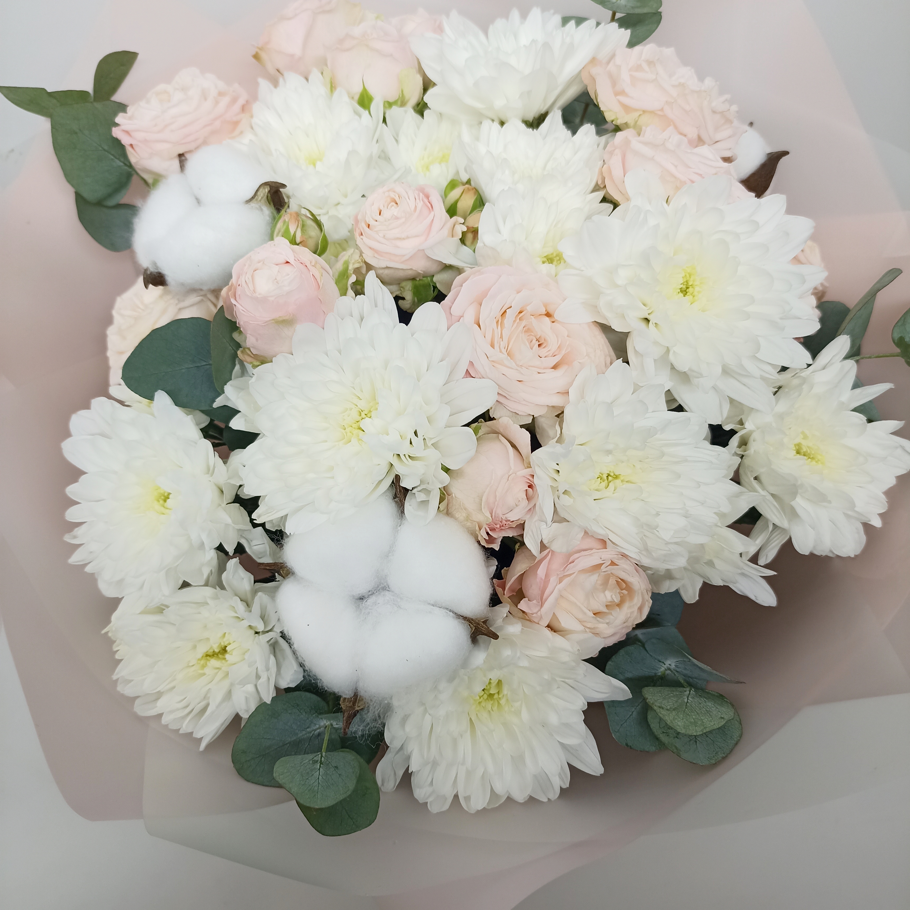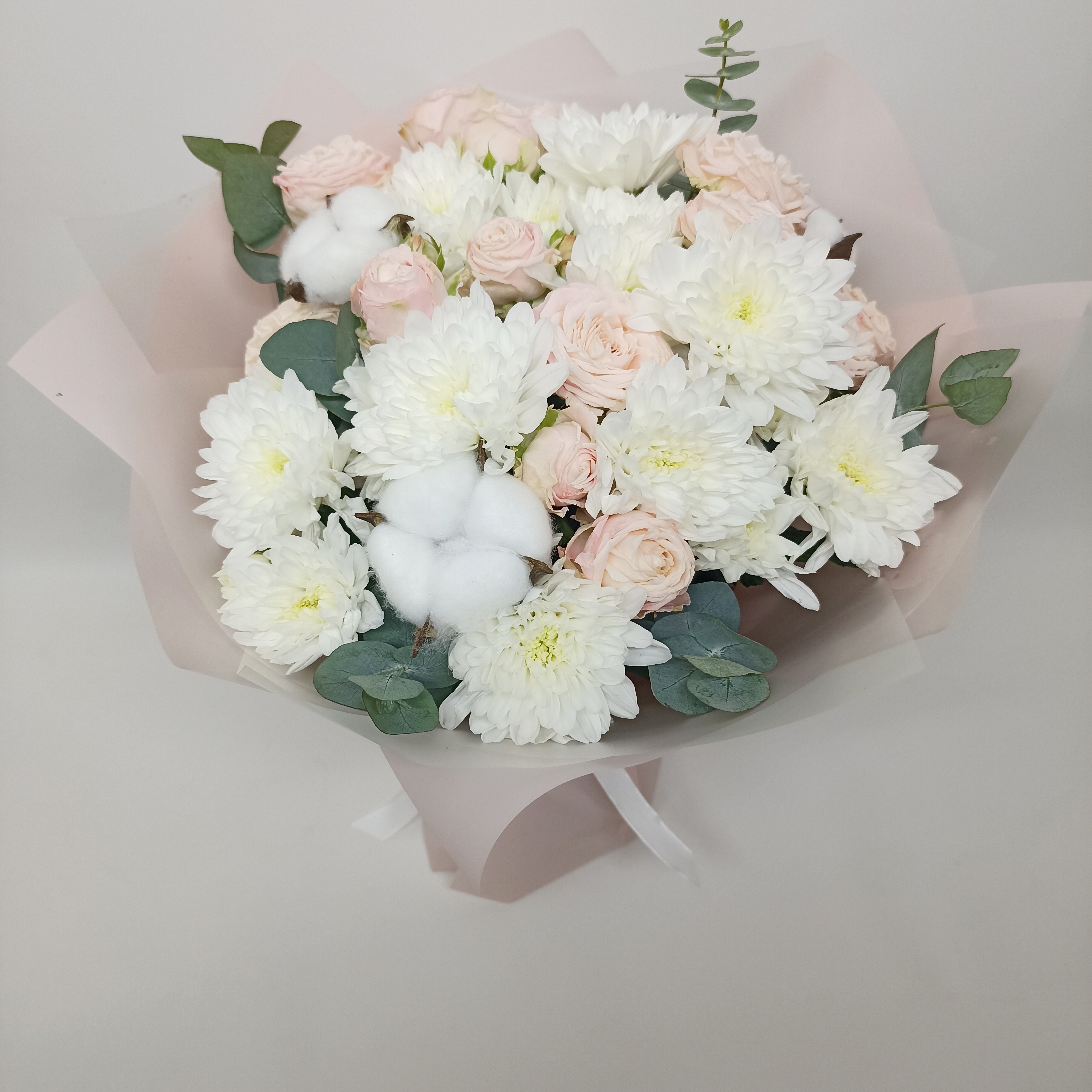 "Букет «Кристина» — элегантное сочетание нежных оттенков кустовых роз и утонченных хризантем. Добавление хлопка придает композиции воздушность и легкость, а изящные ветки эвкалипта подчеркивают изысканность подарка. Идеальный выбор для выражения теплых чувств к любимой женщине, покорения сердца избранницы либо оригинального комплимента близкому человеку."