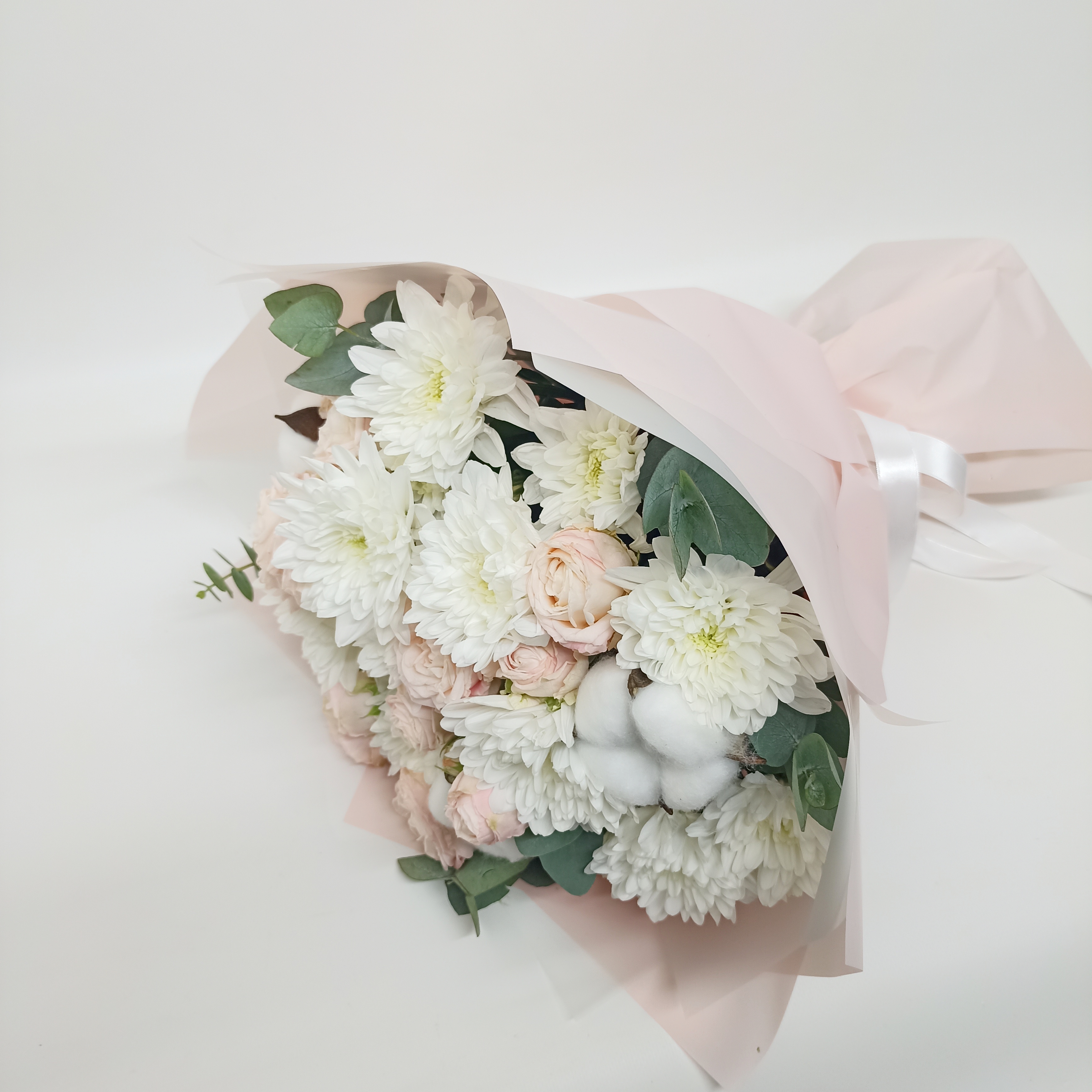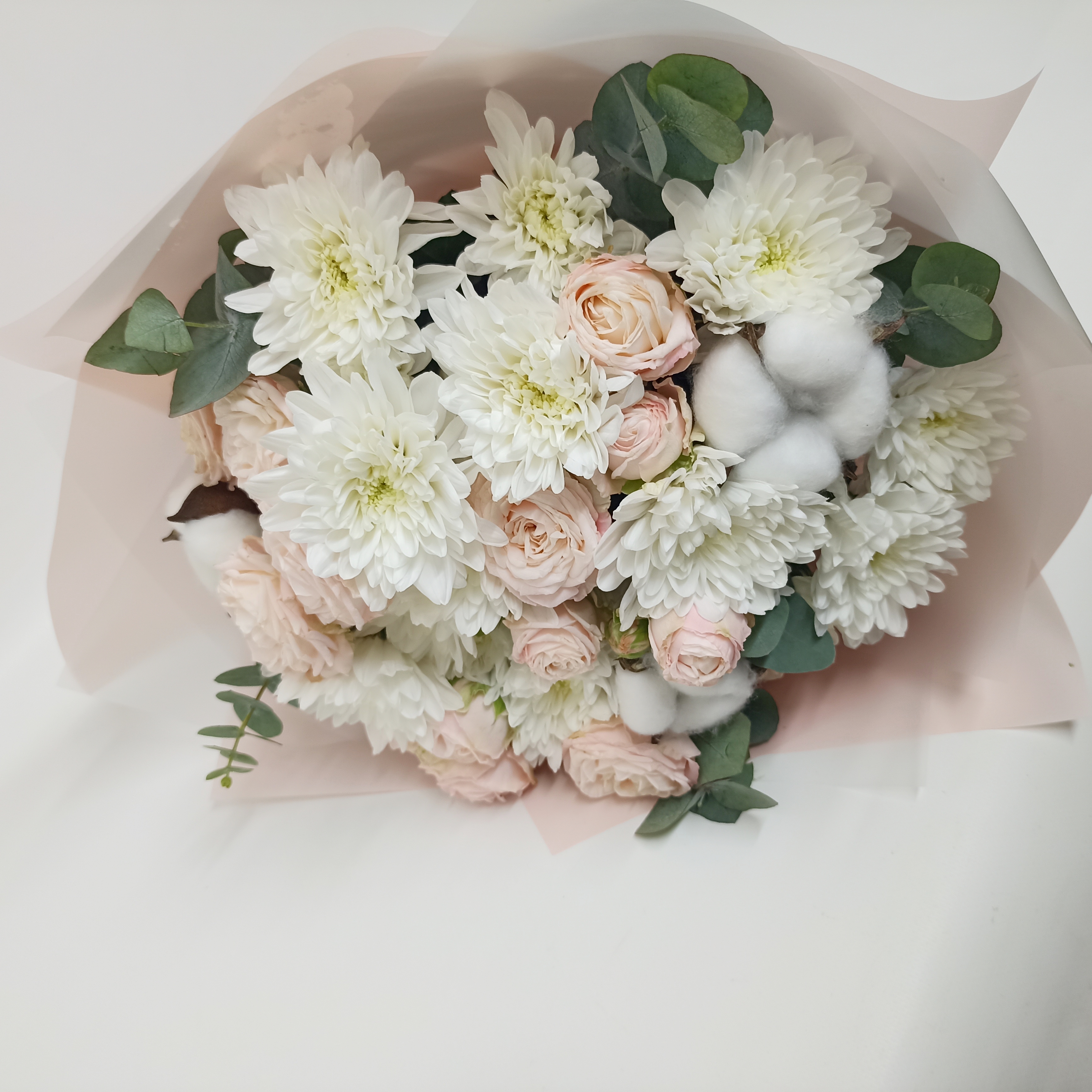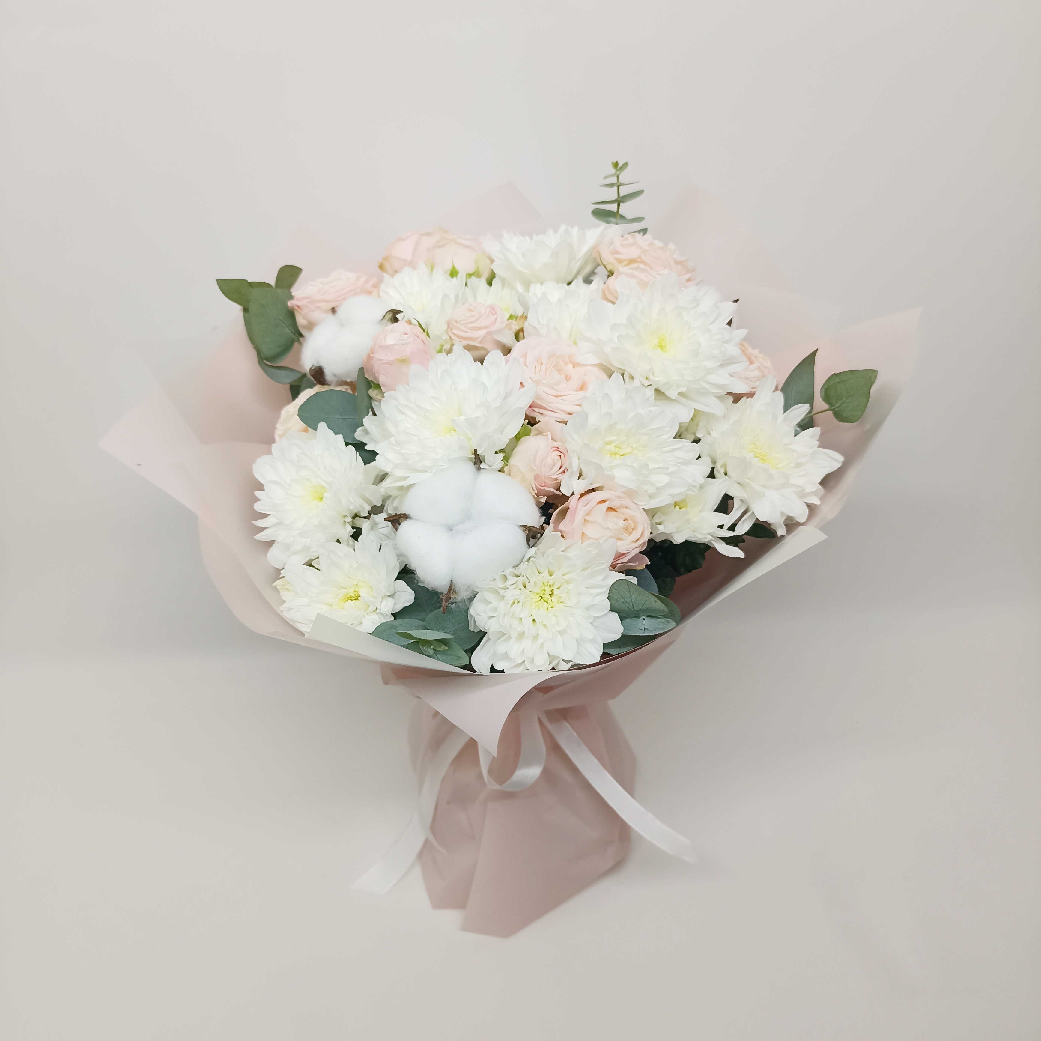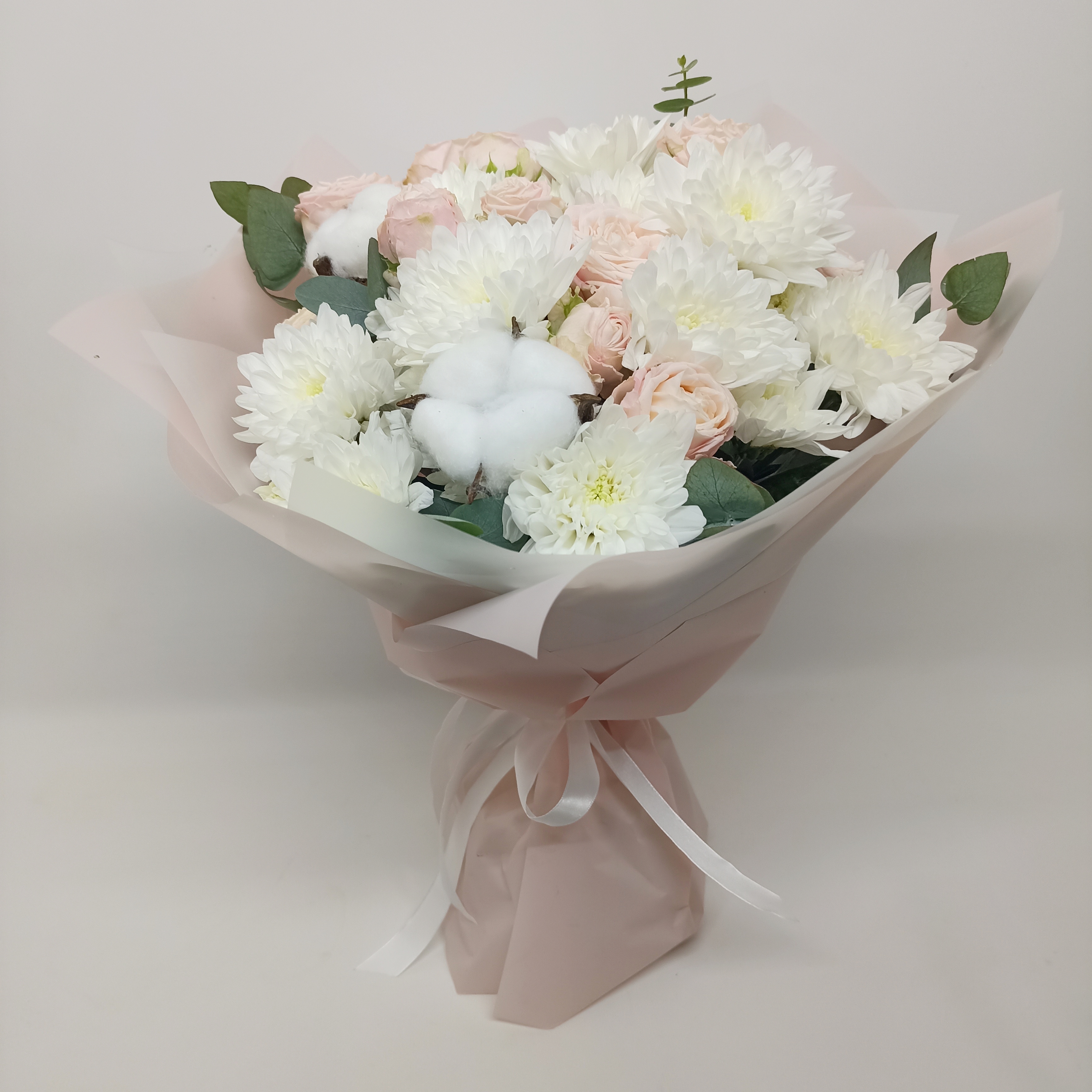 "Букет «Кристина» — элегантное сочетание нежных оттенков кустовых роз и утонченных хризантем. Добавление хлопка придает композиции воздушность и легкость, а изящные ветки эвкалипта подчеркивают изысканность подарка. Идеальный выбор для выражения теплых чувств к любимой женщине, покорения сердца избранницы либо оригинального комплимента близкому человеку."
